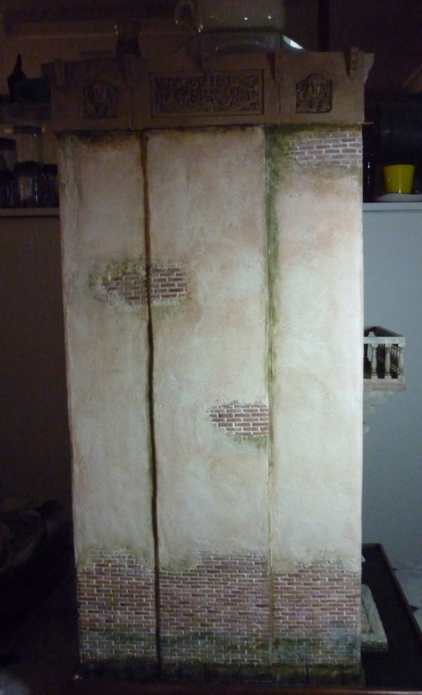 This is my current project – the Venice Canal House – a Rik Pierce workshop held in Wellington, New Zealand, in February this year. It came home in a wooden crate and there it sat until about the middle of June when I was once again able to work on it. I recently finished the last of the external claying and painting and internal floors and walls.